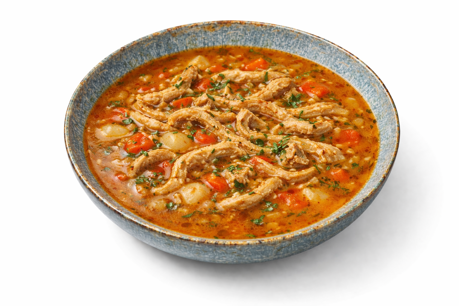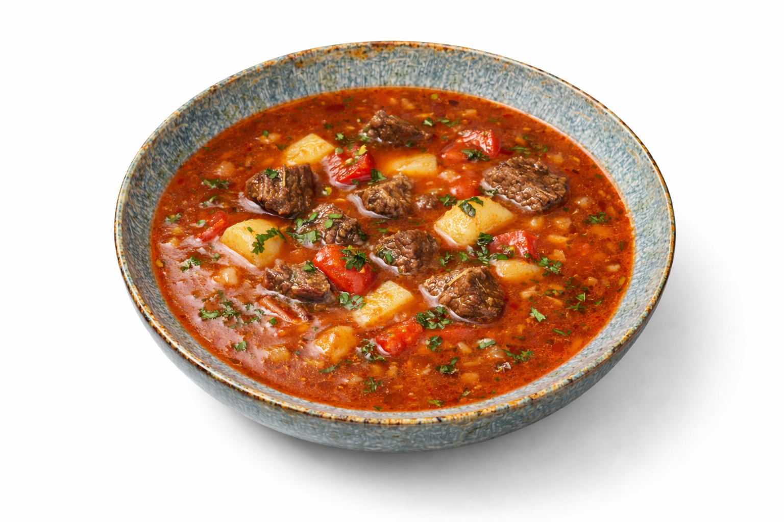 Aromatyczna zupa gulaszowa inspirowana tradycyjną kuchnią węgierską, przygotowana na bazie esencjonalnego wywaru i starannie dobranych składników.