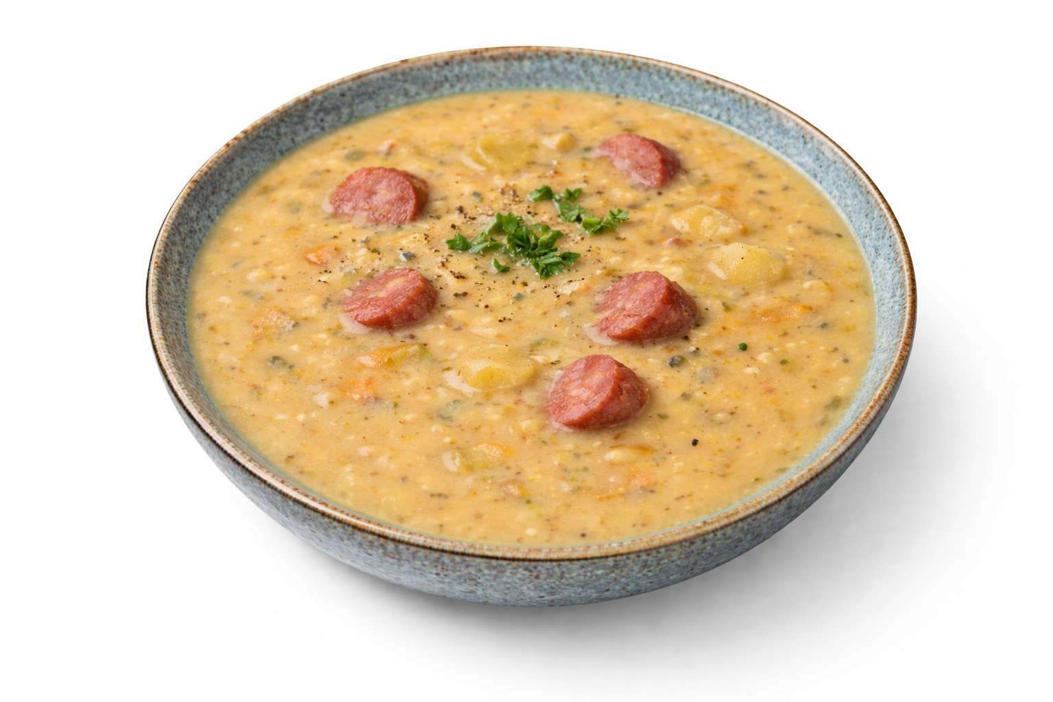 Bazą zupy jest długo gotowany groch, który nadaje jej gęstą, kremową konsystencję. Całość uzupełniają warzywa, czosnek, majeranek oraz kawałki aromatycznej kiełbasy, które podkreślają jej wyrazisty charakter.