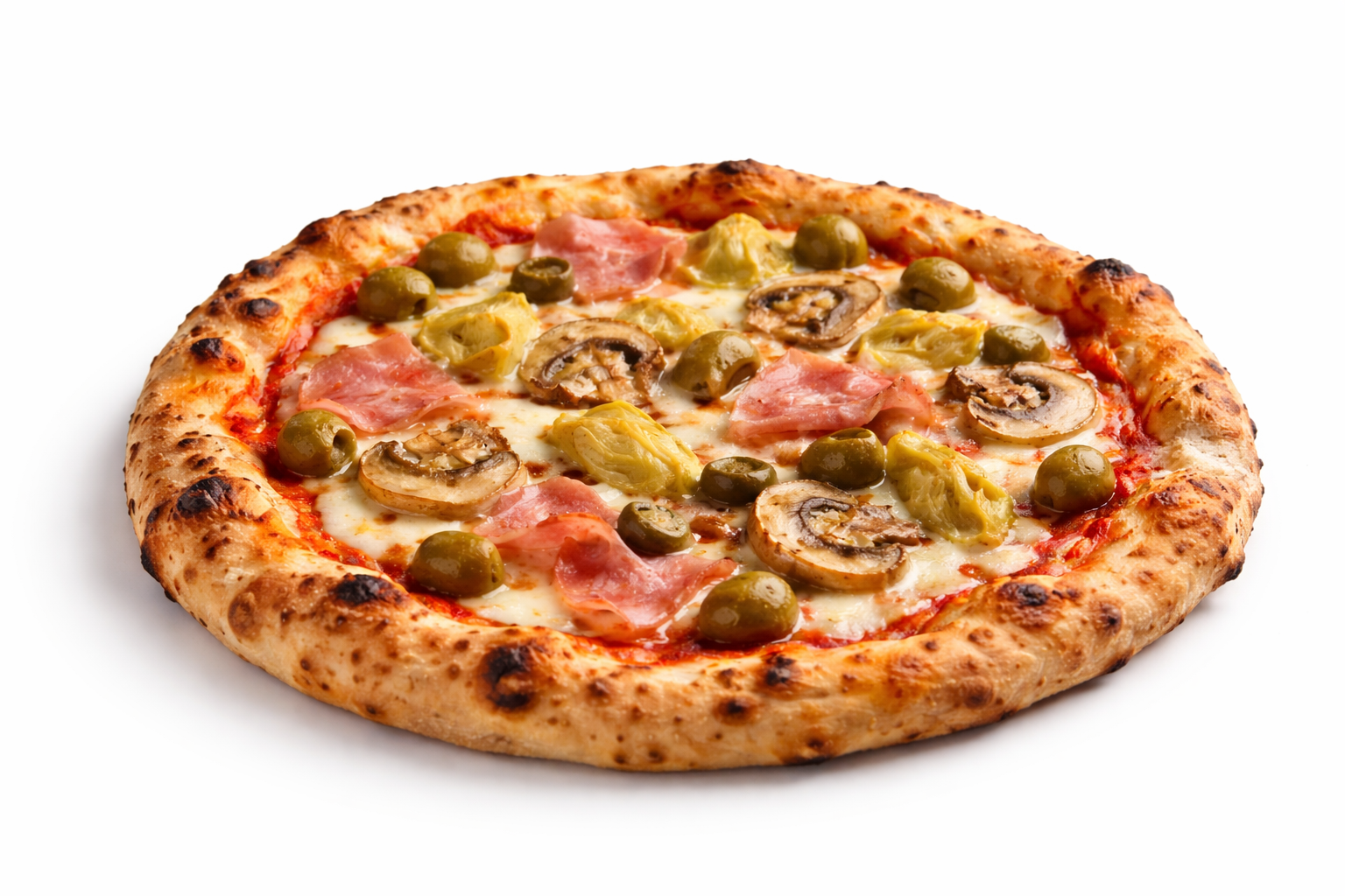 Klasyczna włoska kompozycja na cienkim, chrupiącym cieście. Zaczynamy od intensywnego sosu z pomidorów pelatti, na którym kładziemy delikatną mozzarellę fior di latte. Dopełnieniem są grillowane pieczarki, aromatyczna szynka prosciutto cotto, eleganckie karczochy oraz słoneczne, zielone oliwki. sos pomidorowy pelati, mozzarella fior di latte, oliwki zielone, karczochy, pieczarki, szynka