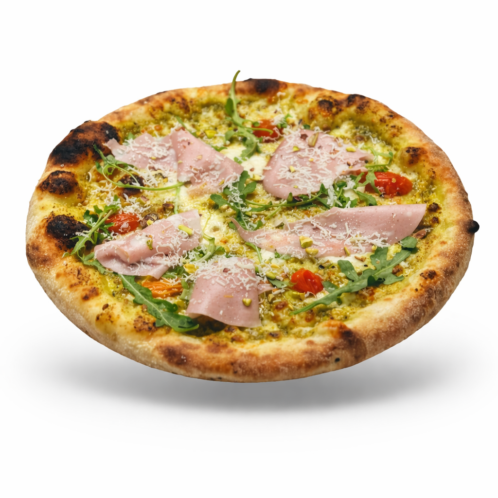 Ciasto na zakwasie z dodatkiem mąki pełnoziarnistej, pesto bazyliowe, mozzarella fior di latte, kulki mozzarelli, pomidorki koktajlowe, wykończone po upieczeniu włoską mortadellą pistachio, rukolą i pistacjami mozzarella mini kulki, pesto bazyliowe,, mortadella pistacchio, rukola, pomidorki koktajlowe, pistacje, grana padano DOP -