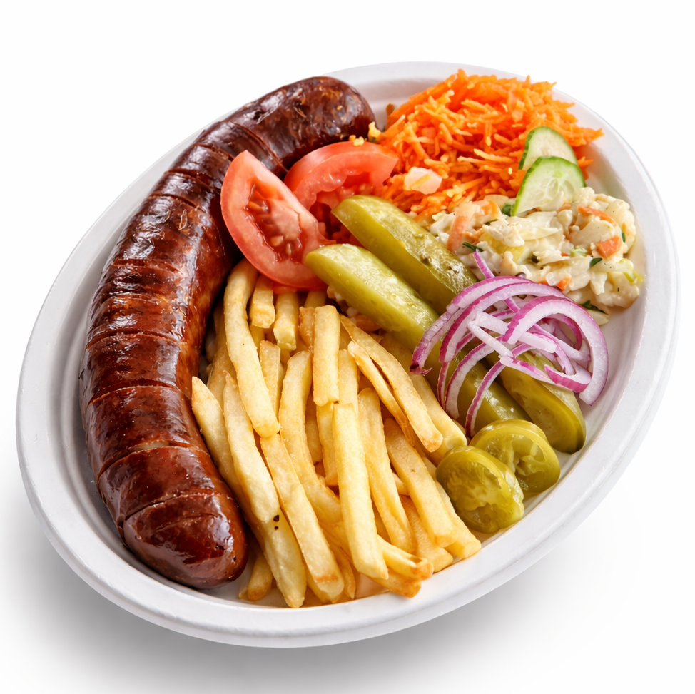 Bagietka, farsz pieczarkowo-cebulowy, ser gołda i mozzarella, cebulka czerwona, ogórek kiszony, kiełbasa, szczypiorek, ketchup